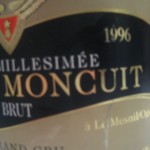 il Millesime 1996 di Pierre Moncuit è quello che più ci ha impressionato. L’abbiamo detto al momento della visita in cantina e degli assaggi di allora (circa tre anni fa), lo ribadiamo con forza oggi, dopo aver stappato (ieri sera, in occasione del compleanno di Roberto “Capitan Harlock” Palazzetti… ancora auguri!) una straordinaria magnum di quel vino (Anzi due, la prima sapeva di tappo, forse si sarà sentito l’eco delle imprecazioni – vedi foto piccola). Lontano dall’essere arrivato al clou, mostra un’articolazione aromatica finissima e complessa, dove le iniziali note minerali e lievitose stanno esplodendo in nuance nitidissime di pietra focaia, leggermente fumè, senza cedere di un passo sul fronte fruttato e floreale.