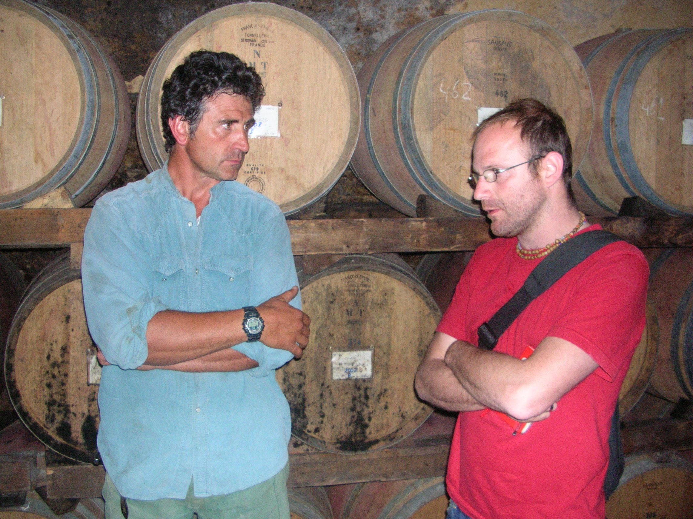 Tecnicamente siamo a Gaiole ma dato che né la terra né il vino si interessano particolarmente alle burocrazie amministrative, diciamo subito che con quel comune l’azienda non c’entra niente e va semmai paragonata ai vicini di Castelnuovo Berardenga, cioè alla parte più meridionale del Chianti Classico. Per origine dei terreni, clima e carattere dei vini (quando a Gaiole piove qui potrebbe esserci tranquillamente il sole, tanto per dire). Monastero cistercense prima, indomito fortilizio poi, oggi San Giusto a Rentennano è tra le realtà di riferimento della denominazione. E mi sono tenuto basso, perché dagli ultimi assaggi si potrebbe tranquillamente esagerare… Proprietà di Enrico Martini di Cigala dal 1957, oggi a condurre l’azienda ci pensano i figli Francesco, Luca (nella foto con Fabio Pracchia) ed Elisabetta. Nel migliore dei modi, direi, e secondo i dettami dell’agricoltura biologica (certificata).