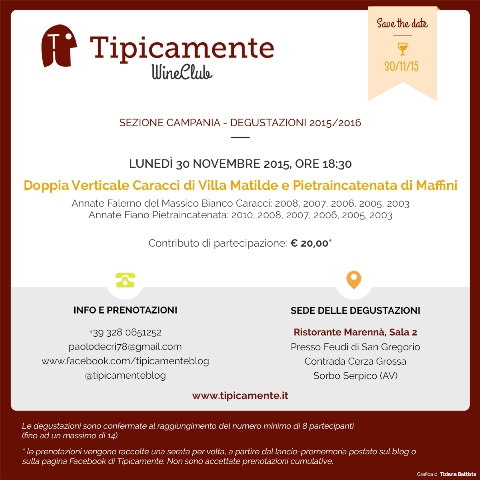 Il prossimo appuntamento del Tipicamente Wine Club è fissato per Lunedì 30 novembre, con la doppia verticale del Falerno del Massico Bianco Caracci di Villa Matilde (annate 2008, 2007, 2006, 2005, 2003) e del Cilento Fiano Pietraincatenata di Luigi Maffini (annate 2010, 2008, 2007, 2006, 2005, 2003). Qui il calendario completo delle degustazioni: link.