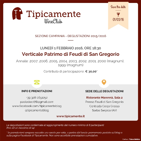 Il prossimo appuntamento del Tipicamente Wine Club è fissato per lunedì 1 febbraio 2016, con la verticale del Patrimo di Feudi di San Gregorio (Annate 2007, 2006, 2005, 2004, 2003, 2002, 2001, 2000 [da magnum], 1999 [da magnum].