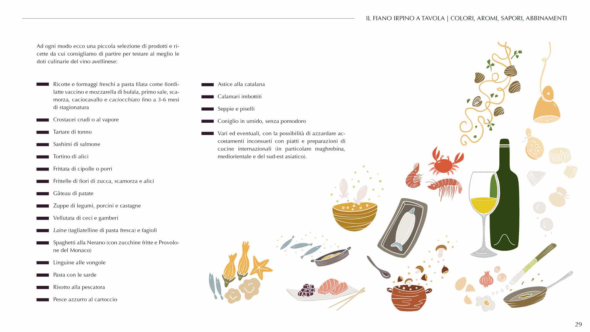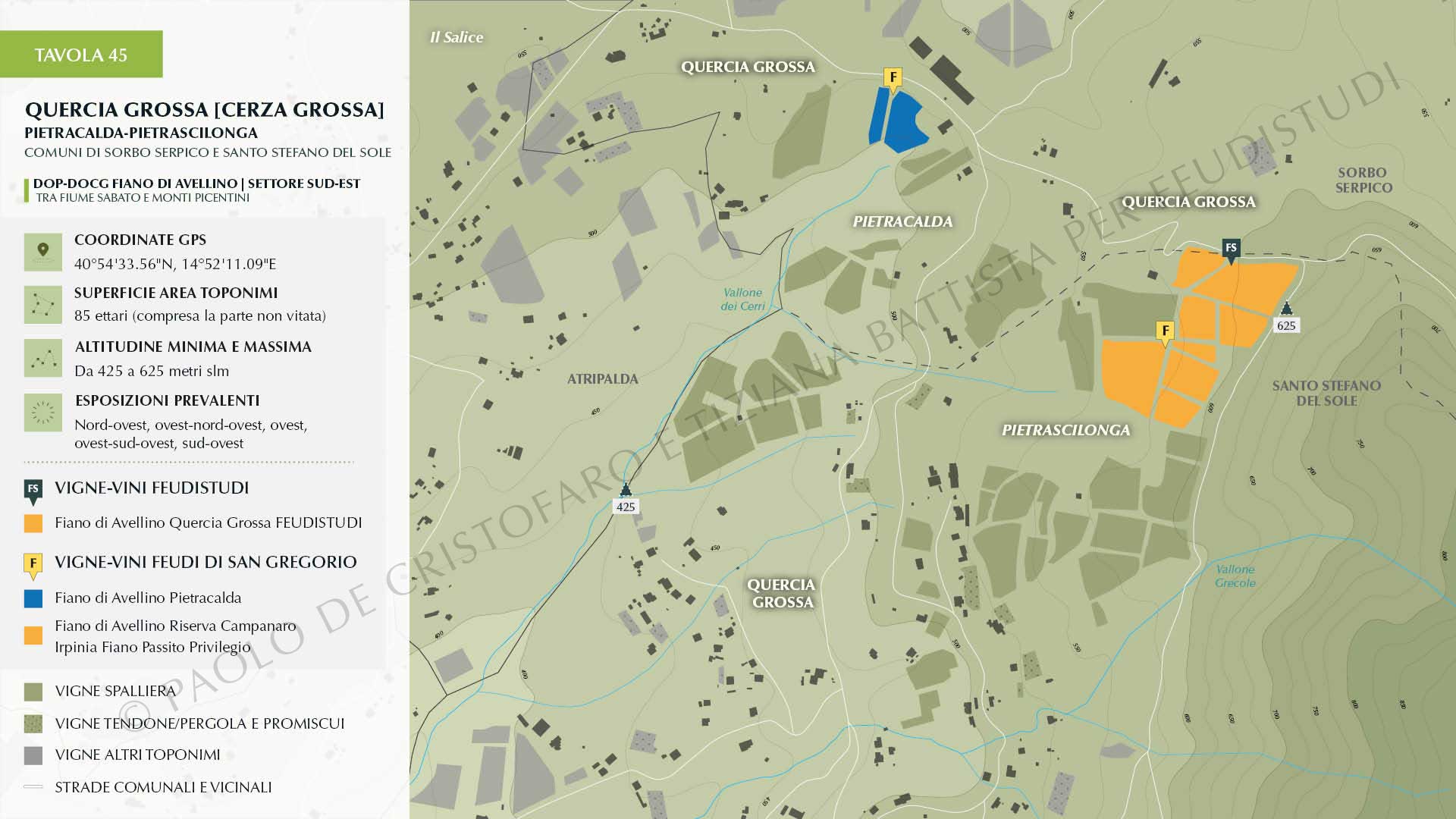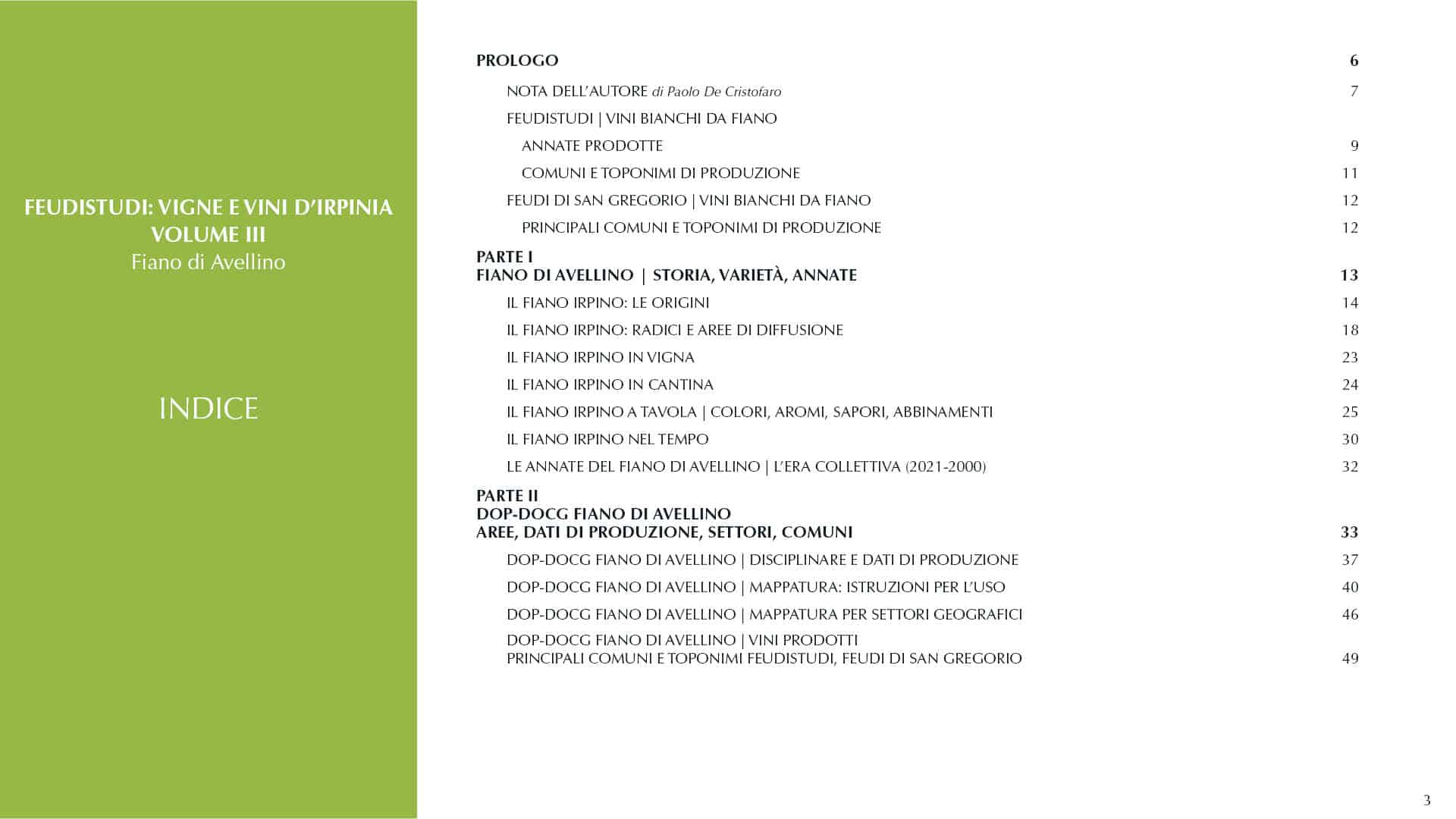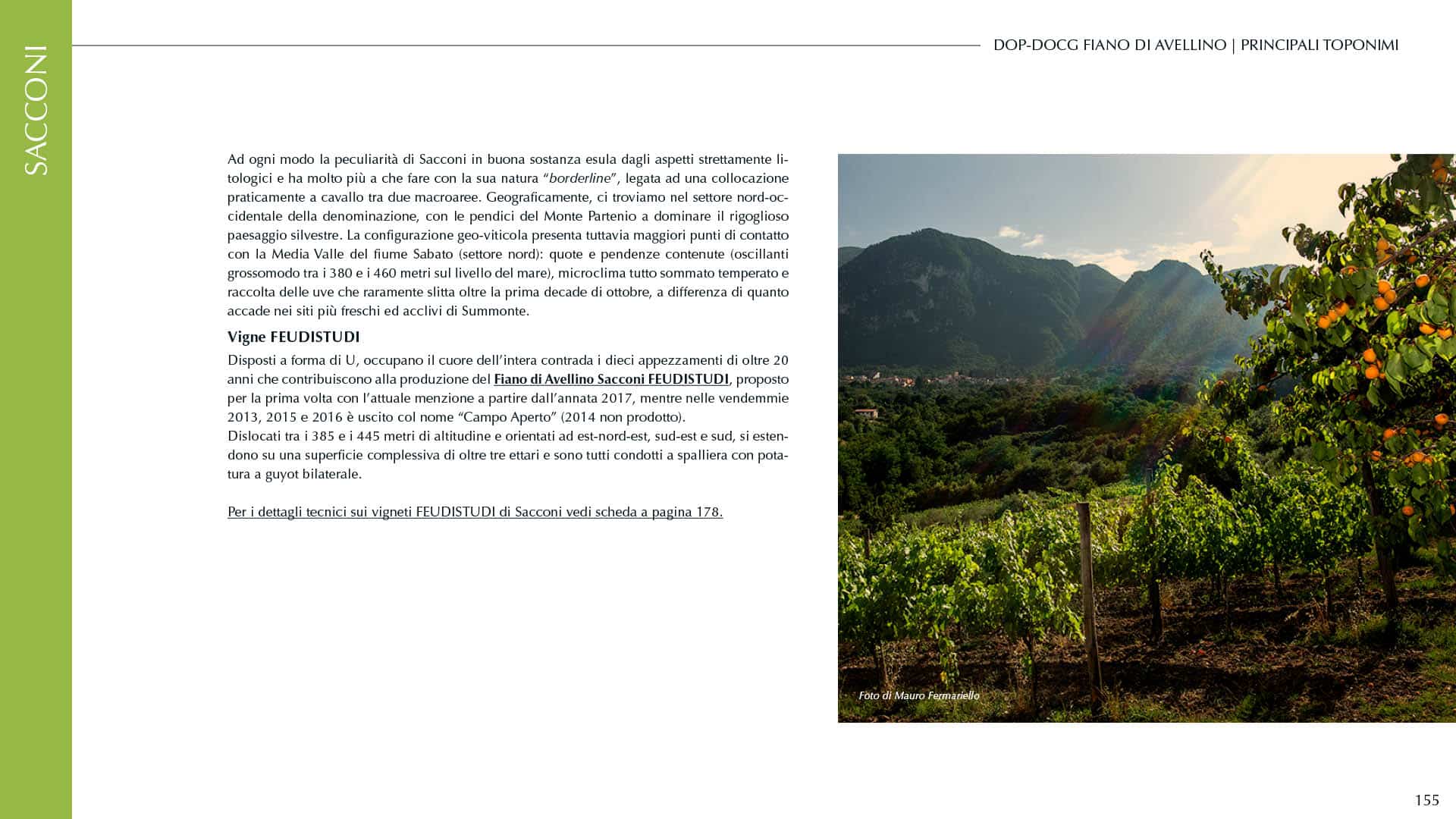 La quarta parte del volume accoglie invece la documentazione completa relativa alle vigne e ai vini che disegnano la proposta FEUDISTUDI a tema: foto aeree e schede tecniche di tutte le particelle vitate che possono contribuire alla produzione dei Fiano inclusi al momento nella gamma, informazioni dettagliate su tutte le annate commercializzate, corredate da profili caratteriali, annotazioni descrittive e consigli per il consumo.