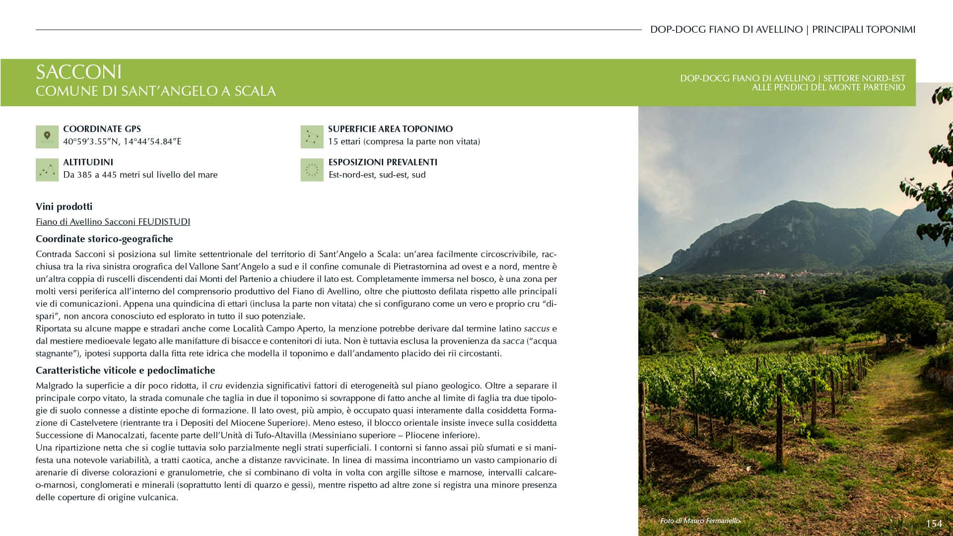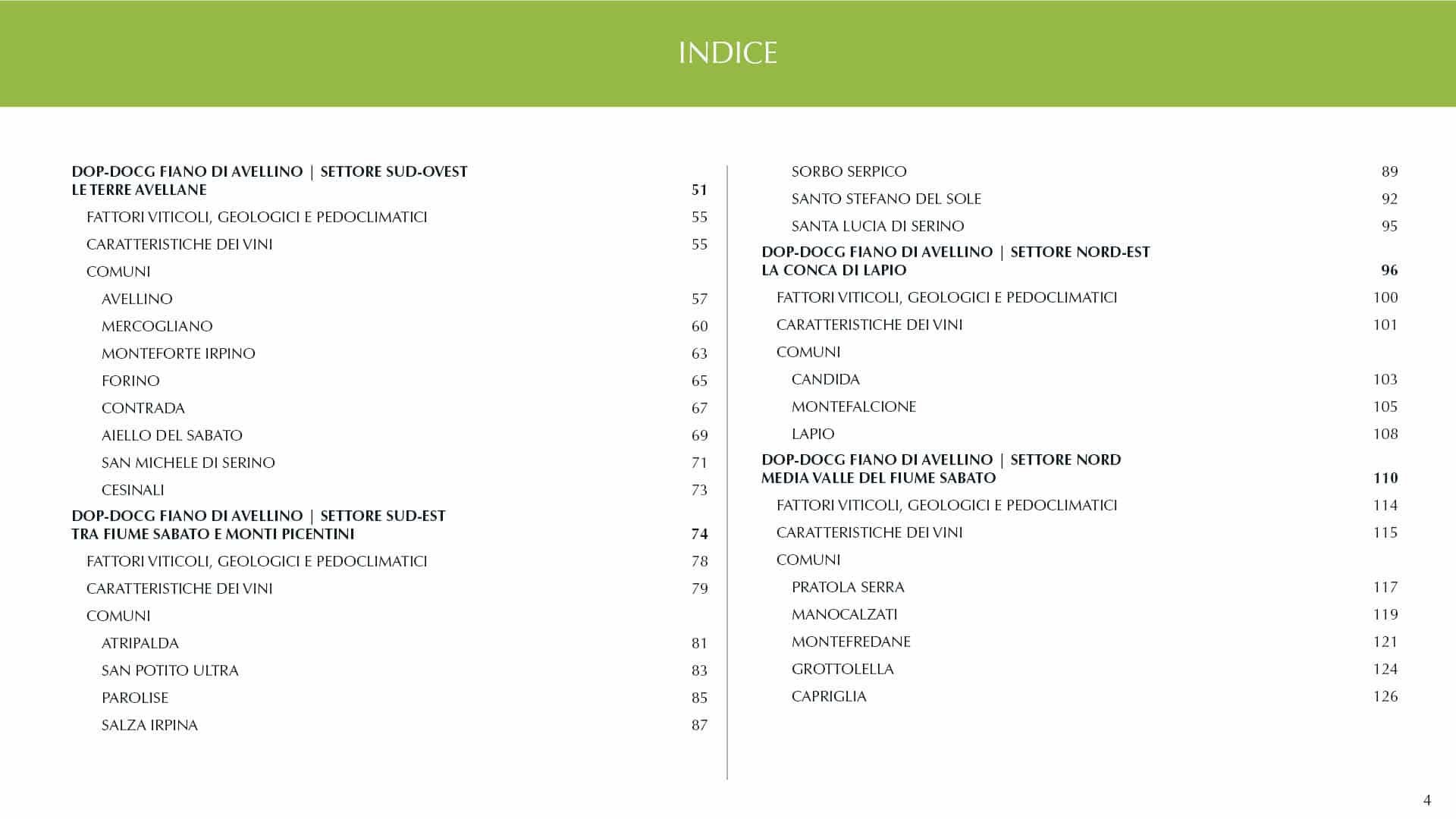 Nella seconda parte entriamo invece nel vivo dell’esplorazione territoriale, passando in rassegna l’area della denominazione con graduali zoom, da macro a micro. Ancora una volta ci guida un metodo di mappatura per settori geografici, finalizzata all’individuazione di aree nelle quali si manifestano significativi fattori di omogeneità geo-viticola, pedoclimatica ed espressiva. Una sezione che ospita inoltre schede e mappe relative a tutti i comuni inclusi nel comprensorio della DOP-DOCG Fiano di Avellino.