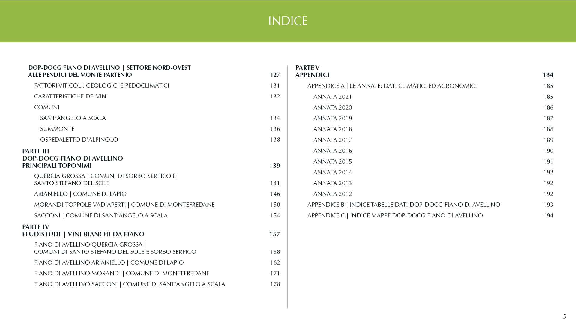 Infine le tre appendici che costituiscono la quinta e ultima parte, dove è possibile recuperare i dati climatici e agronomici raccolti su ogni vendemmia in cui è stata realizzata almeno un’etichetta FEUDISTUDI a base fiano, insieme al riepilogo particolareggiato di tutte le tabelle con i dati di produzione e le mappe relative alla DOP-DOCG Fiano di Avellino.