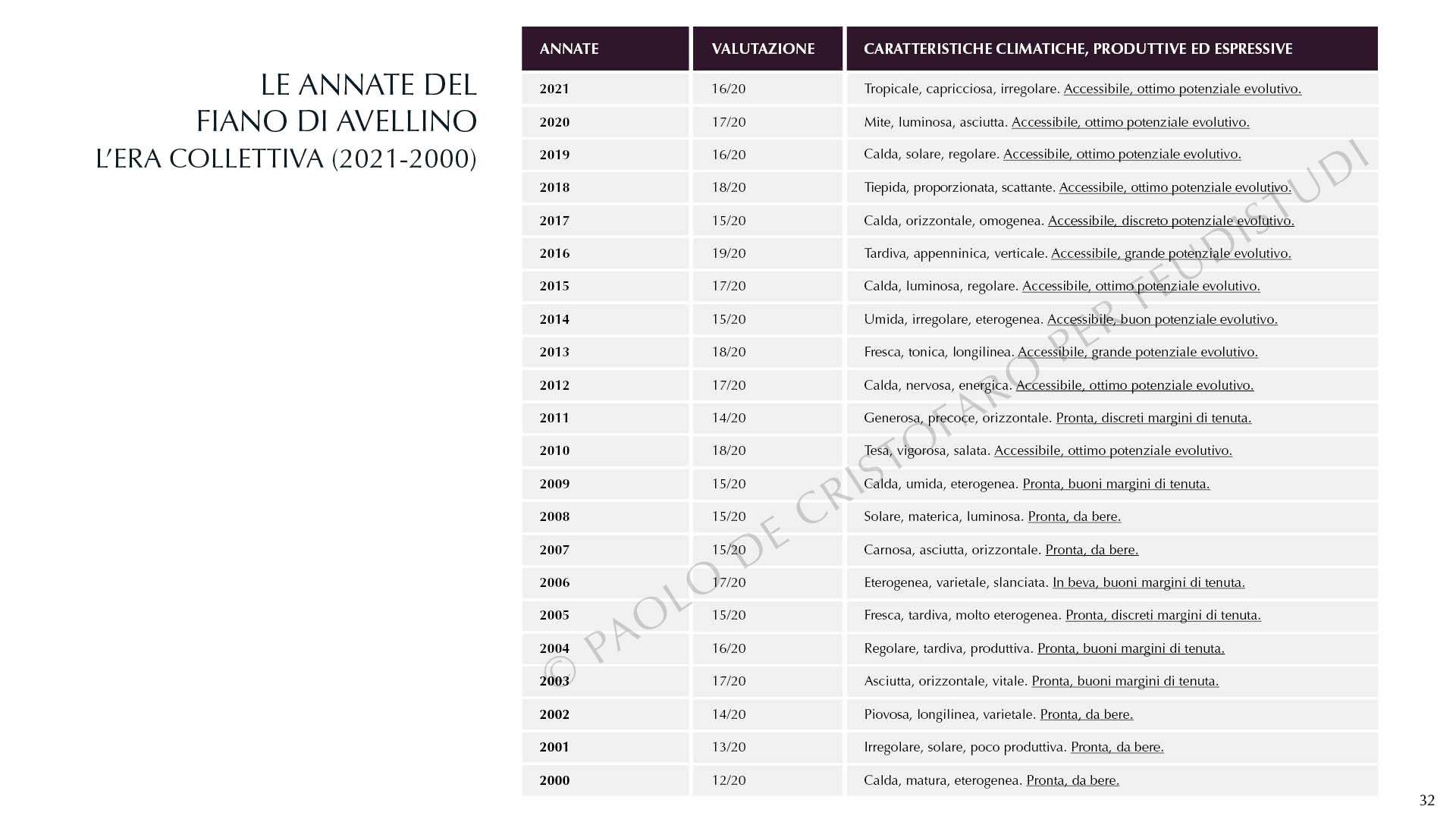 Sempre supportati dal ricco dossier di mappe, illustrazioni e dati, partiamo come di consueto dal riepilogo dei vini bianchi da fiano proposti nelle linee FEUDISTUDI e Feudi di San Gregorio, corredati dalle informazioni sintetiche sui comuni e i toponimi dove vengono prodotti. Prologo a cui segue immediatamente la prima sezione di indagine sulla cultivar irpina: origini, aree di diffusione, profilo agronomico, enologico, espressivo ed evolutivo, i migliori abbinamenti, descrizioni e valutazioni sintetiche su tutte le annate del terzo millennio.